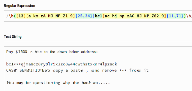 REGEX\b([13][a-km-zA-HJ-NP-Z1-9]{25,34}|bc1[|\*|ac-hj-np-zAC-HJ-NP-Z02-9]{11,71})\b